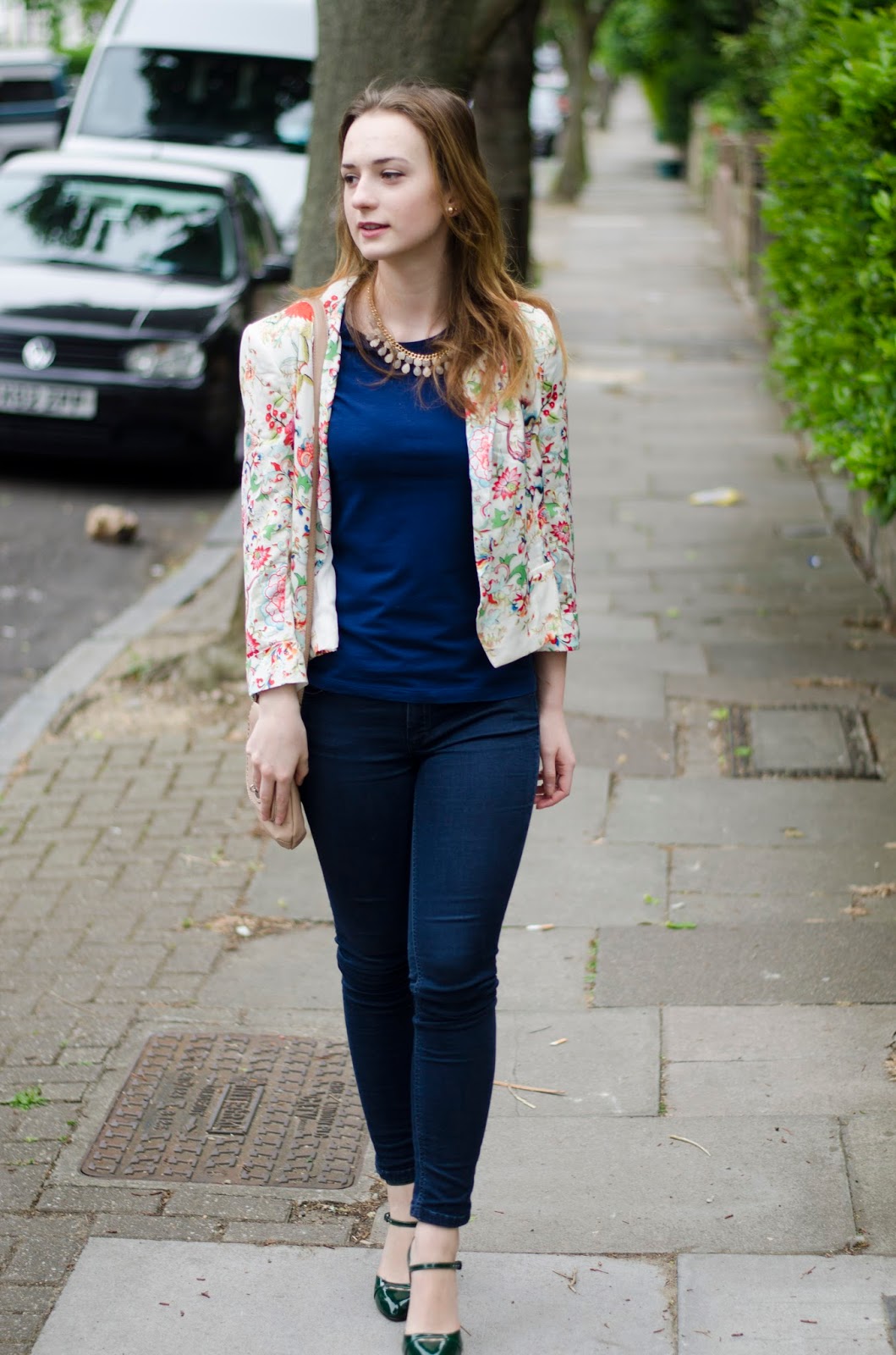 Skoro wszędzie dookoła widać tylko kwitnące kwiaty (tak przynajmniej jest w Londynie) to dlaczego by nie przełożyć tego motywu na nasze ubranie? Jaśniutki żakiet skontrastowałam z ciemną resztą, która właśnie przez tą różnicę kolorów jeszcze bardziej go uwidacznia i skupia uwagę.